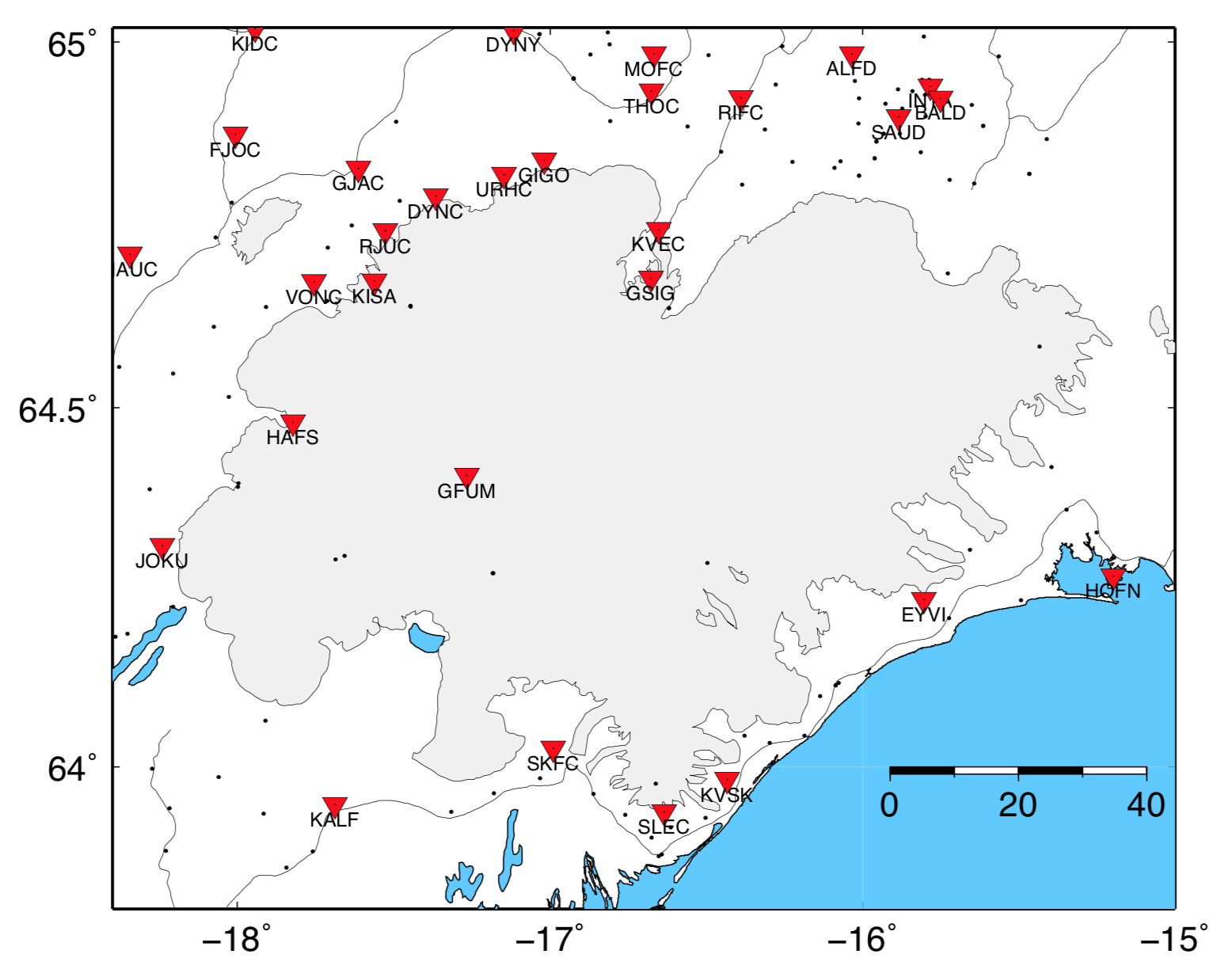 The images are updated regularly, check date on bottom of figure and refresh page as necessary. Stations are ordred roughly from counter-clockwise around Vatnajokull. Click on any image for a higher-resolution image. Please respect copyright of the results. Last 100 days Last 400 days |
